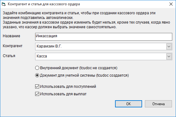 - Разрешить выбор указанной пары "контрагент + статья" при вносе средств в кассу.
