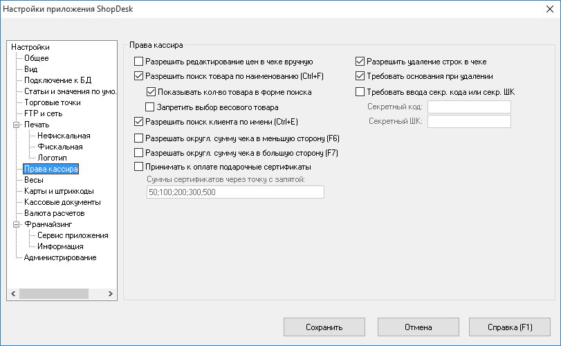 Права кассира Рис.1 Окно настроек Разрешить редактирование цен в чеке вручнуюРекомендуется снять флажок. Цены в чеке могут изменяться только дисконтной картой клиента. Разрешить поиск товара по наименованиямЕсли не у всех товаров есть штрихкоды либо продавцу требуется подбирать товар с помощью формы поиска товара, то оставьте флажок установленным. В остальных случаях флажок должен быть снят. При поиске товара только по штрихкоду исключается человеческий фактор и кассир будет лишен возможности совершить ошибку и выбрать/продать не тот товар. Показывать количество товара в форме поискаРекомендуется отключать флажок при ведении переучета в магазине, чтобы кассиры не знали учетное количество и указывали настоящее, фактическое количество товара при переучете. Запретить выбор весового товараЕсли в магазине используются весы, то рекомендуется отключить возможность ручного выбора весового товара. Такой товар должен попадать в чек только через весы. Разрешить поиск клиента по имениПерсонализованные покупатели идентифицируются с помощью дисконтной карты. В случае, если клиент забыл карту, его можно найти по имени, фамилии, телефону, адресу. Разрешать округлять сумму чека в меньшую сторонуОкругление суммы чека в меньшую сторону, путем отбрасывания копеек. Фактически, предоставляется дополнительная скидка на величину дробной части суммы чека. Разрешать округлять сумму чека в бо́льшую сторонуОкругление суммы чека в бо́льшую сторону, путем прибавления копеек до целого числа, без дробной части суммы. Фактически, происходит дополнительная наценка (отрицательная скидка). Принимать к оплате подарочные сертификатыОдна из форм маркетингового инструмента. Подарочный сертификат - предоплаченная сумма. Вы эмиттируете эти сертификаты и вручаете их клиентам, а они могут с их помощью получать скидку на сумму чека на величину номинала сертификата. Сдача по сертификату не дается. Учтите, что подарочный сертификат - это не форма оплаты, а величина скидки. Суммы сертификатов через точку с запятойЗдесь укажите допустимые номиналы эмиттированных сертификатов. В форме оплаты кассир сможет выбрать один из этих номиналов. Разрешить удаление строк в чекеДопускается ли удаление строк в чеке. При следовании жестким политикам безопасности в учете не допускается удалять строки из чека. Требовать основания при удаленииПри менее строгих политиках безопасности учета удаление строк из чека допускается, но кассир обязан ввести пояснение, по какой причине их чека была удалена строка с добавленным товаром. Это пояснение сохраняется в журнале и доступно для аудита. Требовать ввода секретного кода или секретного штрихкодаГибрид предыдущих двух политик безопасности, когда ответственность за удаление разделяется между двумя ответственными лицами - кассиром и старшим кассиром, у которого есть жетон с секретным штрихкодом. При необходимости удалить позицию, кассир обращается к старшему кассиру и тот подтверждает это действие, сканируя свой жетон со штрихкодом по требованию Shopdesk. Секретный кодСекретный код, который может быть предоставлен кассиру разово, например, из-за отсутствия в данный момент старшего кассира с его жетоном или по телефону. После однократного использования этого секретного кода администратор обязан его сменить. Секретный 