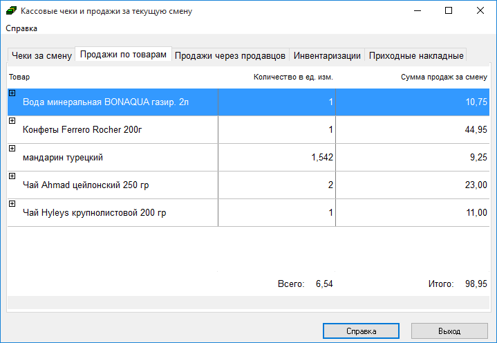 Отчеты - продажи по товарам Форма представляет собой отчет по продажам в разрезе товаров. По клику на значок "+" можно просмотреть список чеков, в которых содержится этот товар. Рис.1 Отчет "Продажи по товарам".