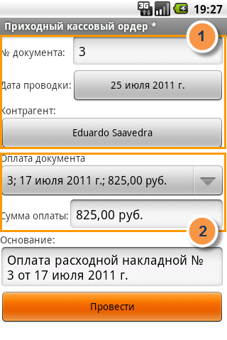 Приходный кассовый ордер Приходный кассовый ордер 1. Шапка документа. № документа Номер документа, устанавливается автоматически, увеличивается на единицу, при открытии нового документа. Имеется возможность указать номер вручную. Дата проводки Дата проводки (создания) документа. Имеется возможность редактировать дату проводки вручную. Для этого необходимо зажать кнопку с датой и в открывшемся окне указать необходимую дату. Контрагент Плательщик денежных средств. 2. Информация об оплате. Оплата документа Номер связанного документа, дата и сумма к оплате. Нажатием на стрелку открывается список неоплаченных расходных накладных. Можно переопределить данный кассовый ордер на оплату любой другой неоплаченной накладной. Сумма оплаты Сумма, оплачиваемая данным кассовым ордером.