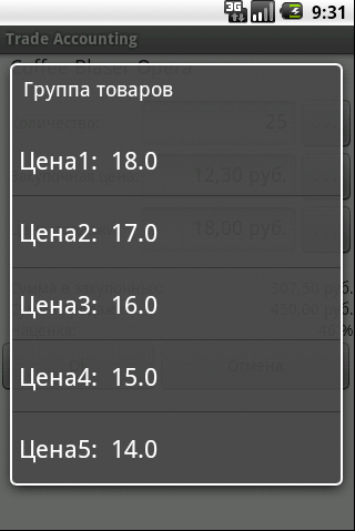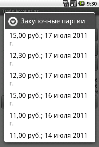 Редактор закупочных партий В приходной накладной, в разделе «Перечень товаров» нажимаем кнопку «Добавить». Откроется справочник товаров. В справочнике выбираем товар, который нужно добавить в накладную. Откроется Редактор закупочных партий. Редактор закупочных партий Количество Количество приходуемого товара. При открытии редактора в данном поле стоит количество по умолчанию (из карточки товара). Закупочная цена Закупочная цена товара. Можно ввести вручную или выбрать из списка закупочных цен предыдущих партий товара. Список закупочных цен открывается по кнопке "...", возле закупочной цены. Список закупочных цен Цена продажи Розничная цена товара. Можно ввести цену вручную либо, нажав на кнопку , установить любую из справочных цен на данный товар. Справочные цены