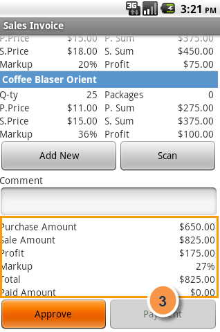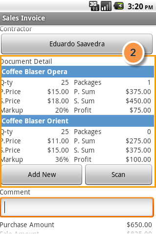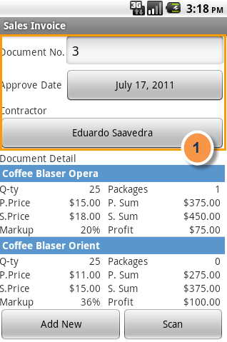 2. The list of goods in the invoice. Goods is added to the invoice on the button "Add New" or by using a barcode scanner (the button "Scan"), Editor parties for sale opens . To edit or delete existing records, you can use the context menu (holding the box with the desired product).