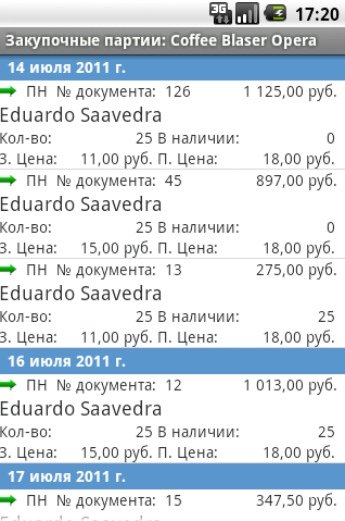 Список партий, т.е поступлений товара. В списке можно увидеть номер приходной накладной, по которой поступил данный товар, поставщика, закупочную и продажную цены, а также поступившее количество и остаток товара из данной партии.